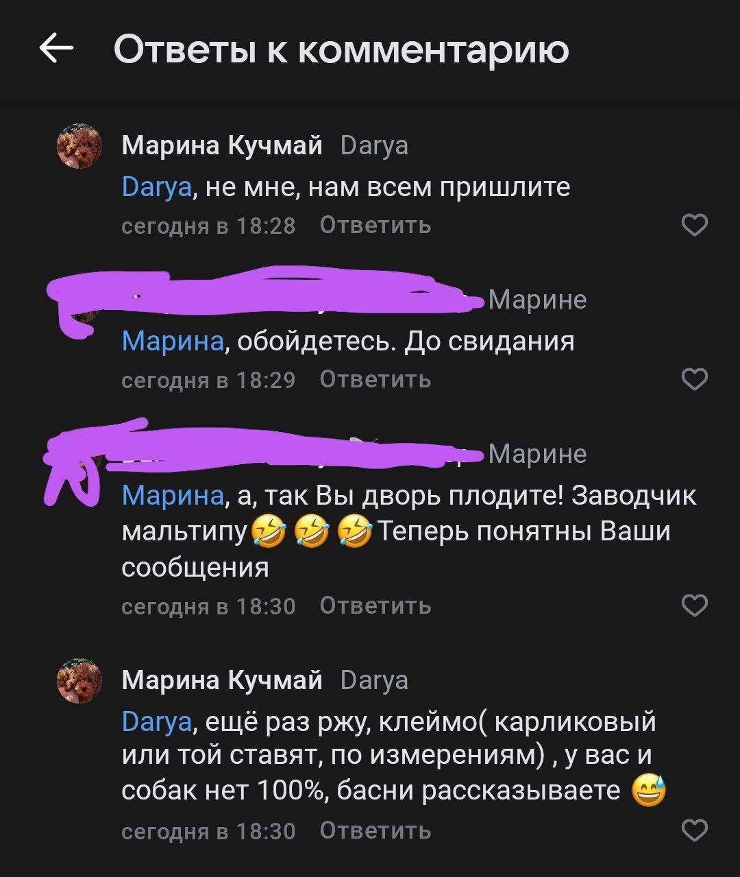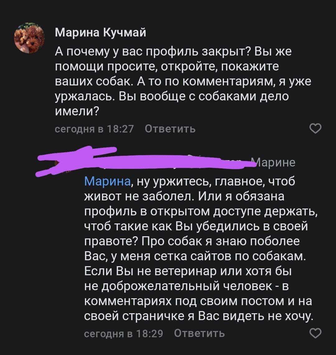 Плодит дворь, разбрасывается желчью в тематических пабликах по собакам. Оскорбила меня, как хозяйку, за вопрос о малом весе и росте пуделя с проблемами опорно-двигательного аппарата.