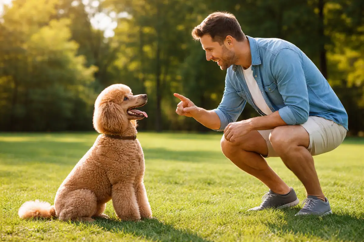 Для пуделя оптимальны два метода - шейпинг и наведение лакомством. Механическое давление на круп работает хуже, потому что умная порода быстро формирует негативную ассоциацию с командой.